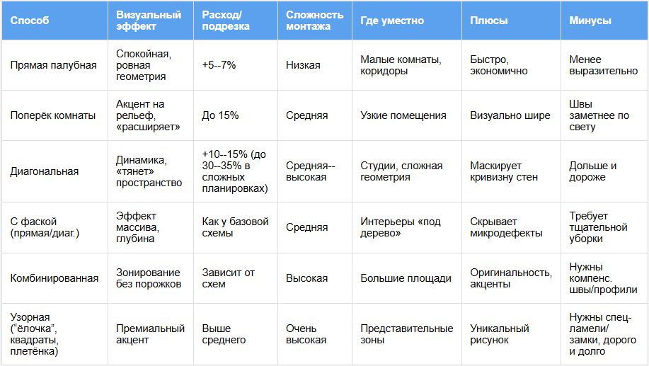 Сравним способы укладки ламината по ключевым параметрам: